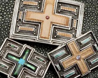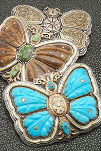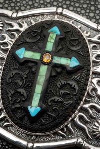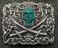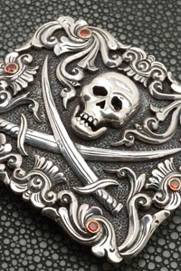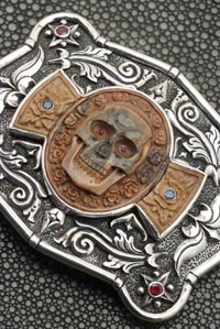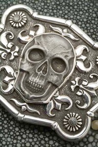 The Buckle : Its a hand constructed sterling silver buckle, the skull itself also hand carved from a billet of Damascus steel. Its probably about the 4th one in a series of 10 that I made between 2005 and 2006. The little bits on the border are Fleur de Lis....(thats French, oh no)....not German eagles! I am fairly sure that the 4 corner stones are uncut natural diamond crystals. I used those on only one of the series. This one was purchased at Falconhead this past spring, in Brentwood, California.